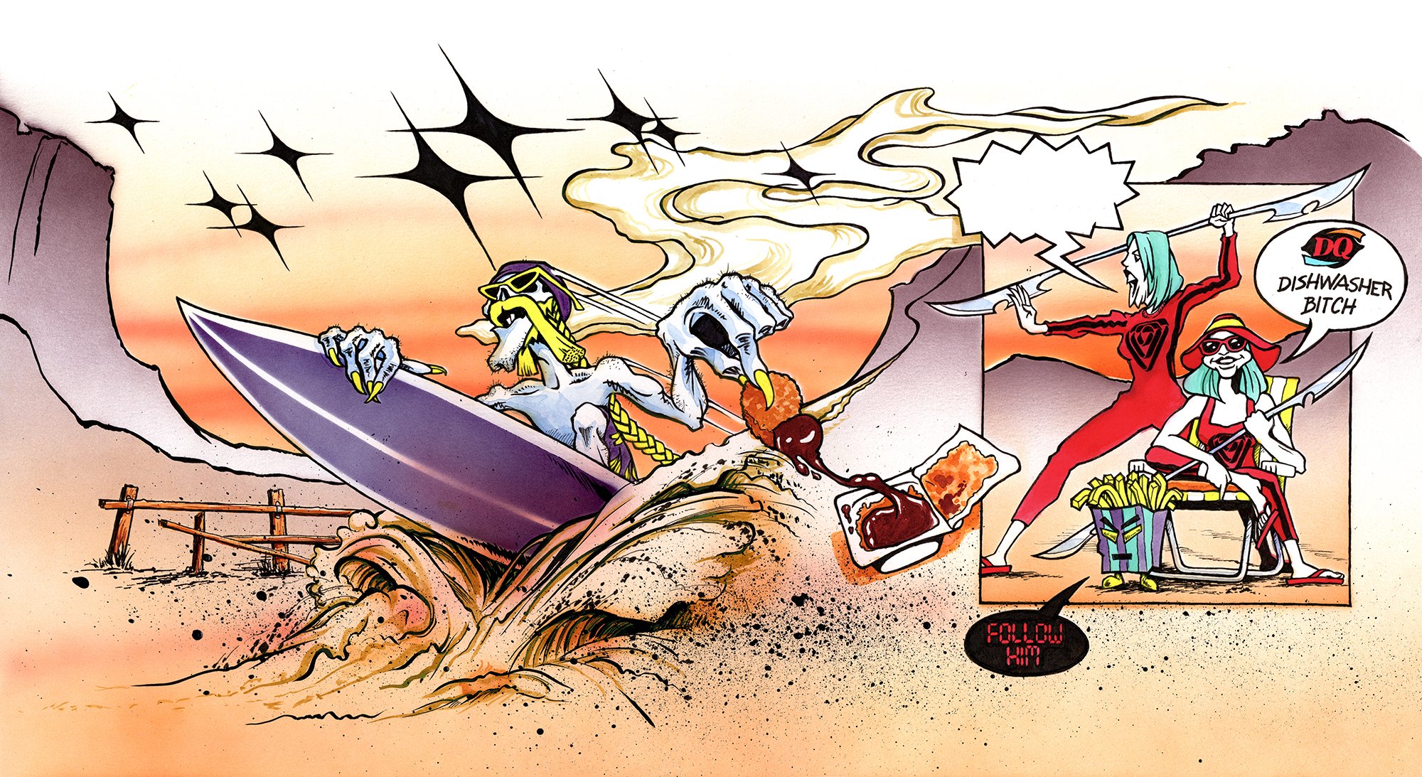 Pen & Airbrushed watercolor on bristol board 24”x13”